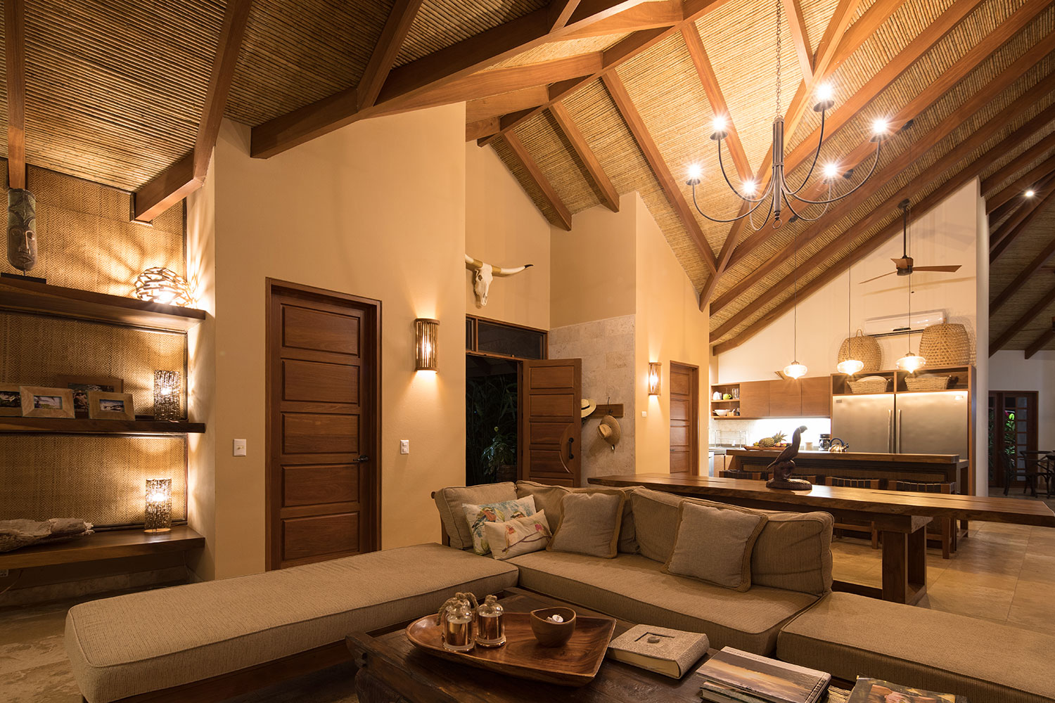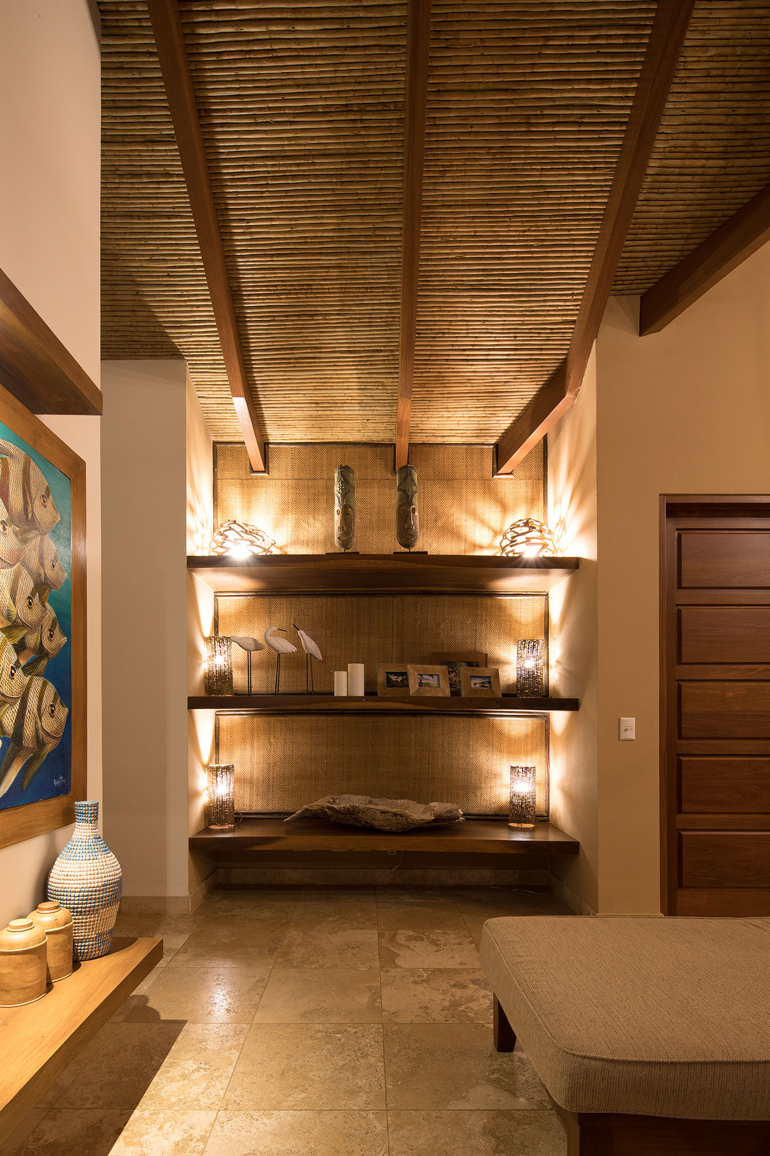For this project, natural teak wood, along with the floor finish and bamboo cane ceilings in the social areas, provide the necessary elegance to give the house its unique style. Decorative elements and stone cladding are used to enhance the interior spaces, adding greater quality and sophistication.