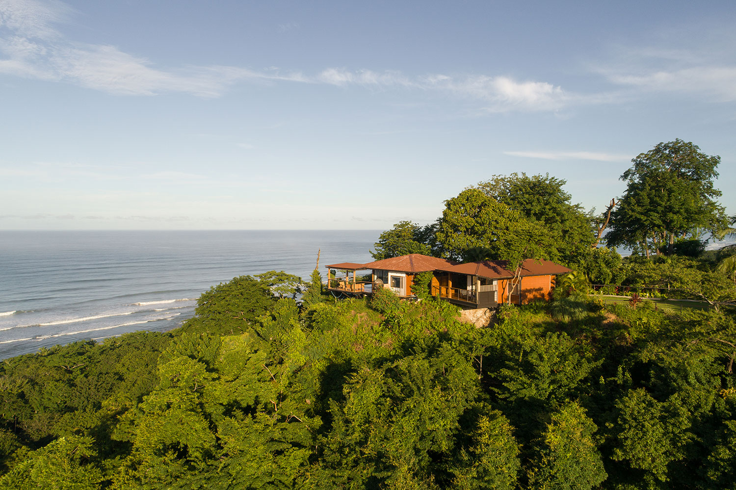 The hotel was designed following sustainability principles: respecting the existing trees on the land, taking advantage of the views and ocean breeze, and studying the sun’s trajectory to maximize natural light and minimize heat and direct sun exposure. It was built using locally sourced materials, including cultivated wood and some of the rooms are practically suspended over the hills.