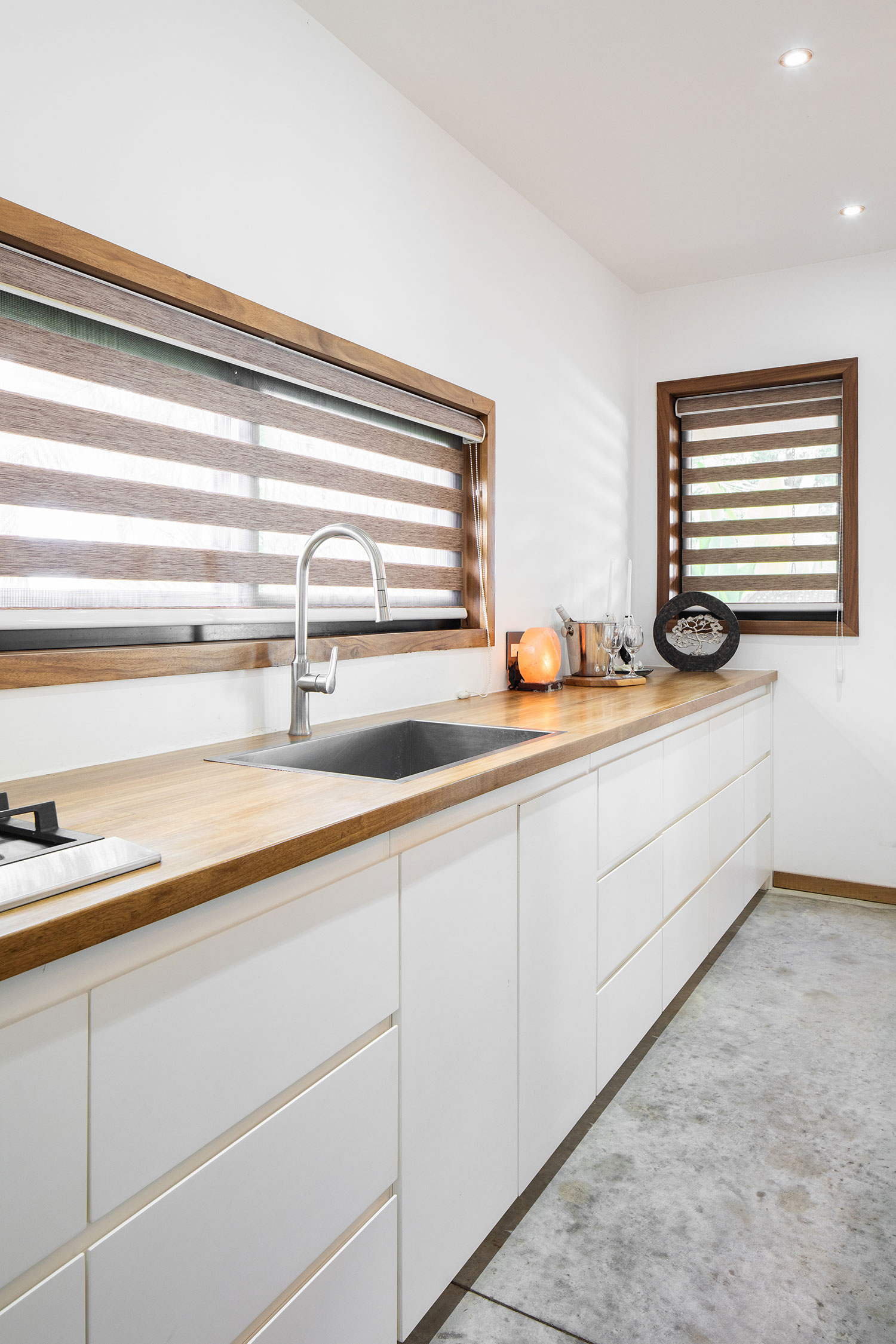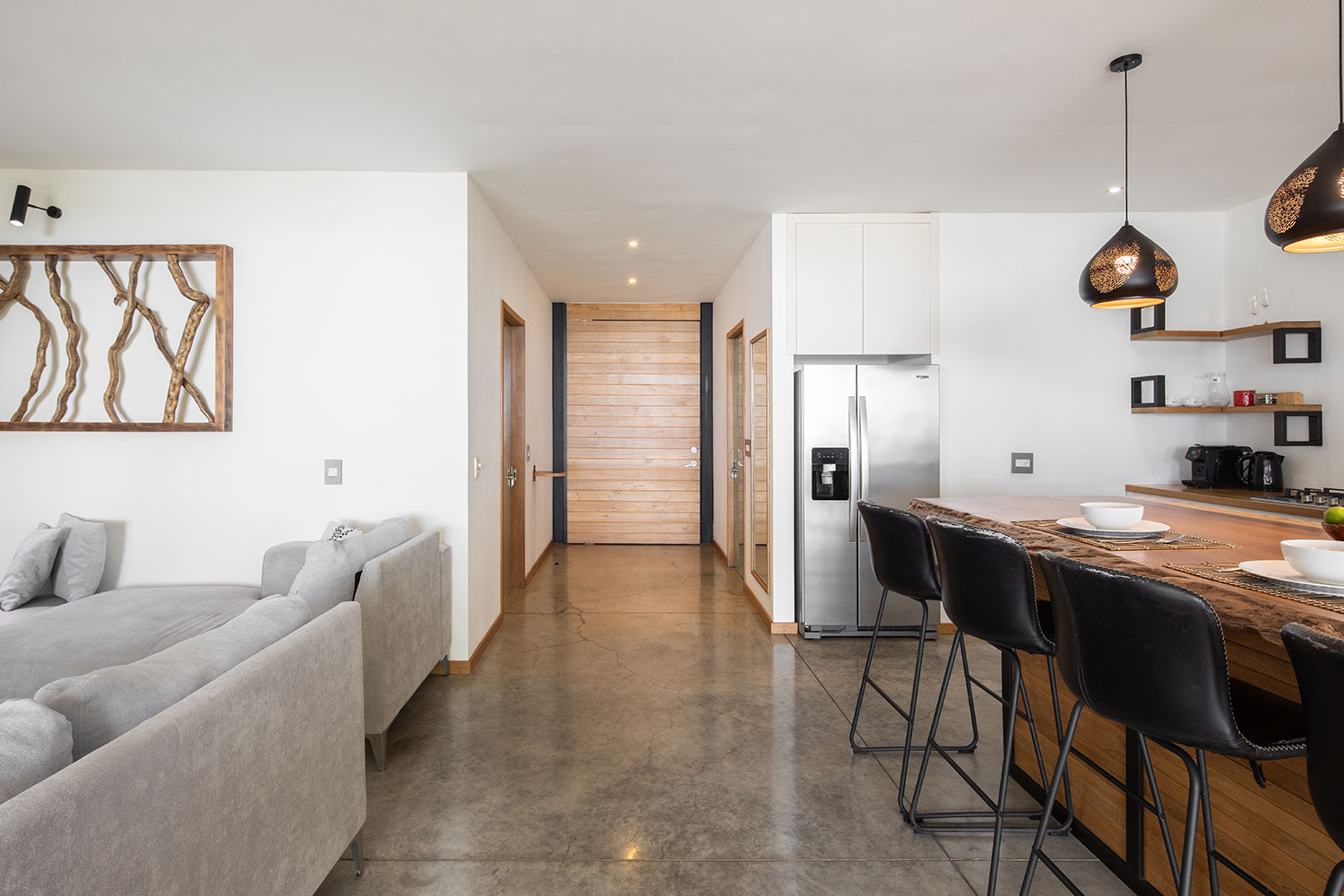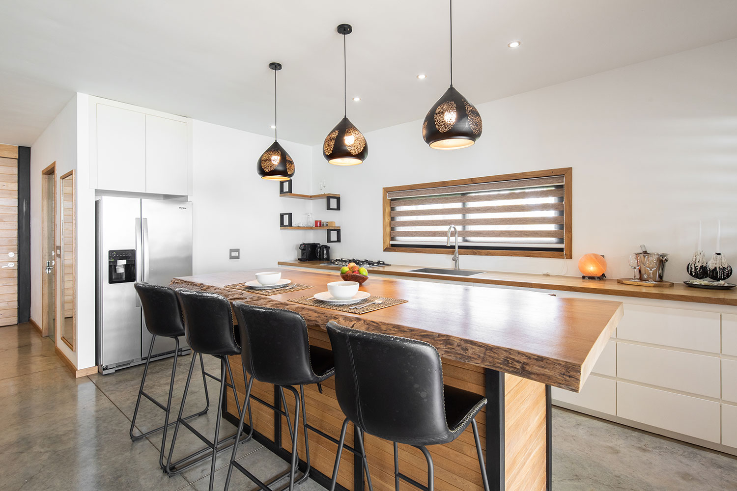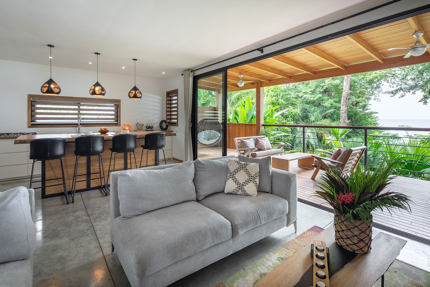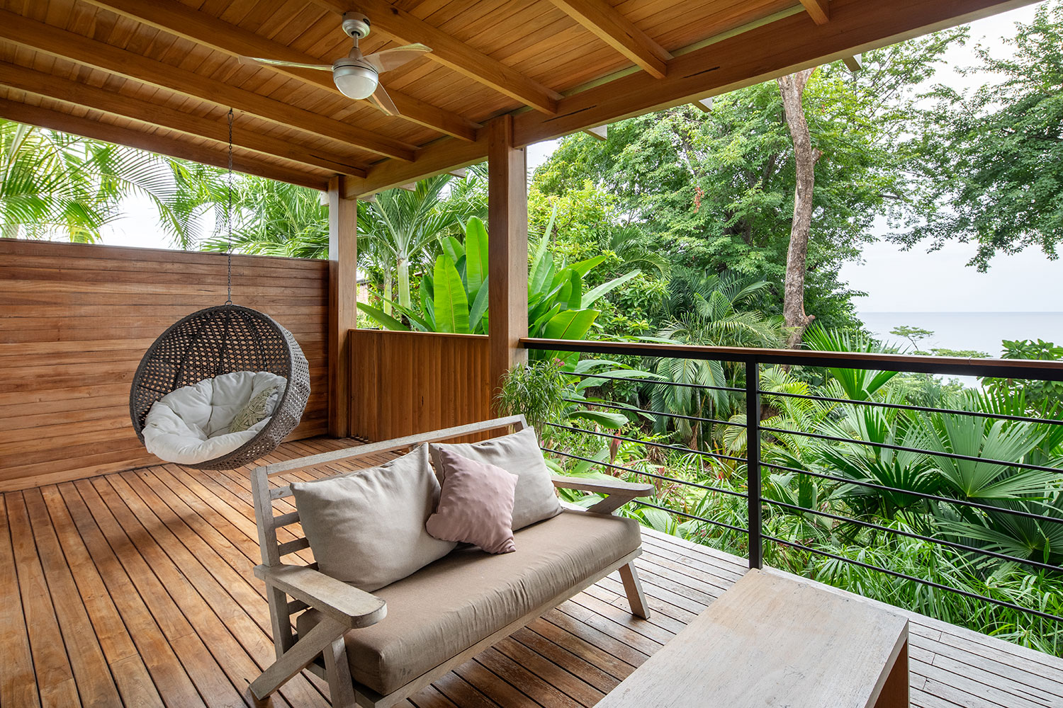 This villa was designed following sustainability principles, such as maximizing natural light and airflow for ventilation. The private elevated deck offers great privacy and features its own jacuzzi while overlooking the Pacific Ocean. The villa also includes a separate bedroom, a fully equipped kitchen, and an indoor living area. It is part of the Vista del Alma boutique hotel, located atop the hills of Santa Teresa, offering breathtaking views of the ocean and sunset while combining aesthetic architectural design, sustainable materials, and practical considerations.